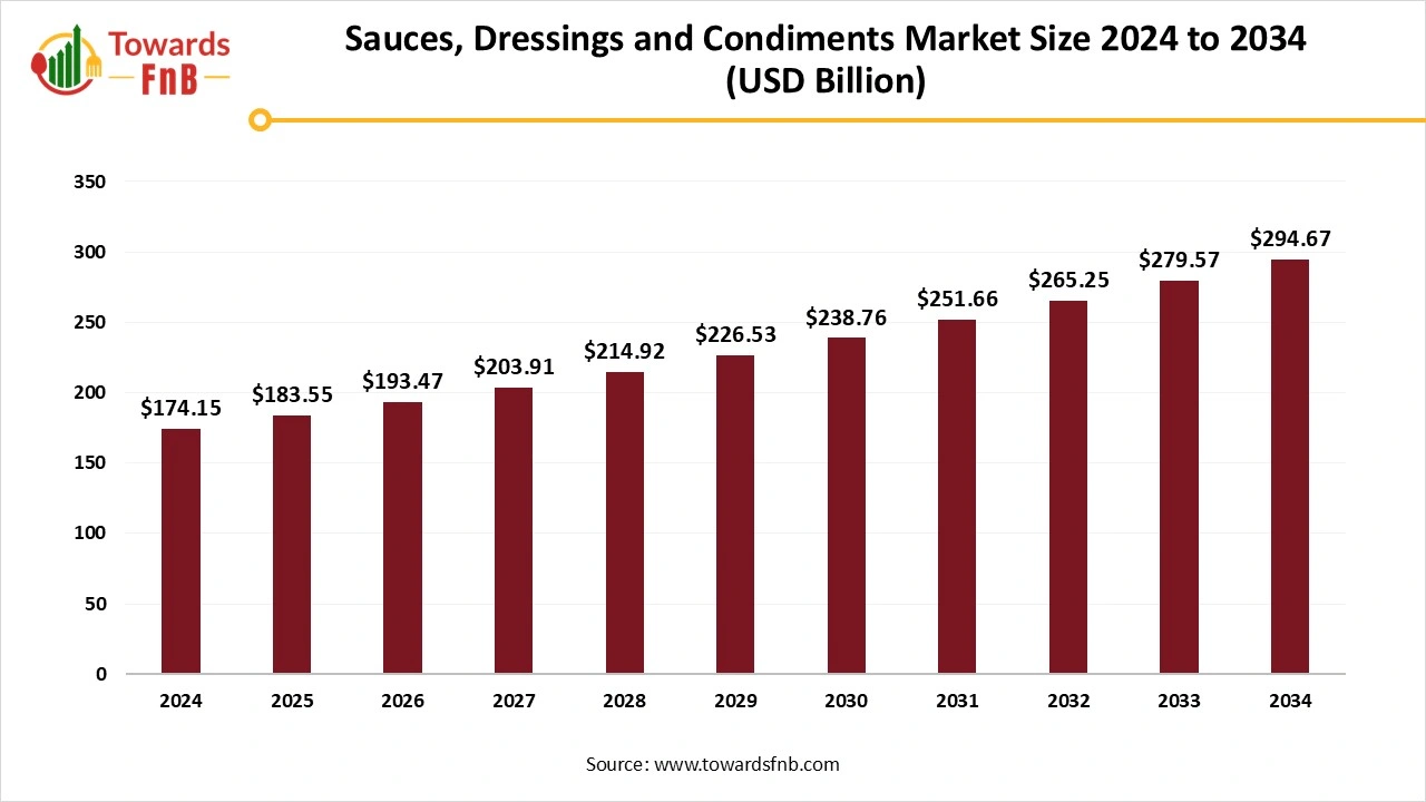 Ottawa, Oct. 31, 2025 (GLOBE NEWSWIRE) -- The global sauces, dressings, and condiments market size stood at USD 174.15 billion in 2024 with projections indicating a rise from USD 183.55 billion in 2025 to approximately USD 294.67 billion by 2034, according to a report published by Towards FnB, a sister firm of Precedence Research.